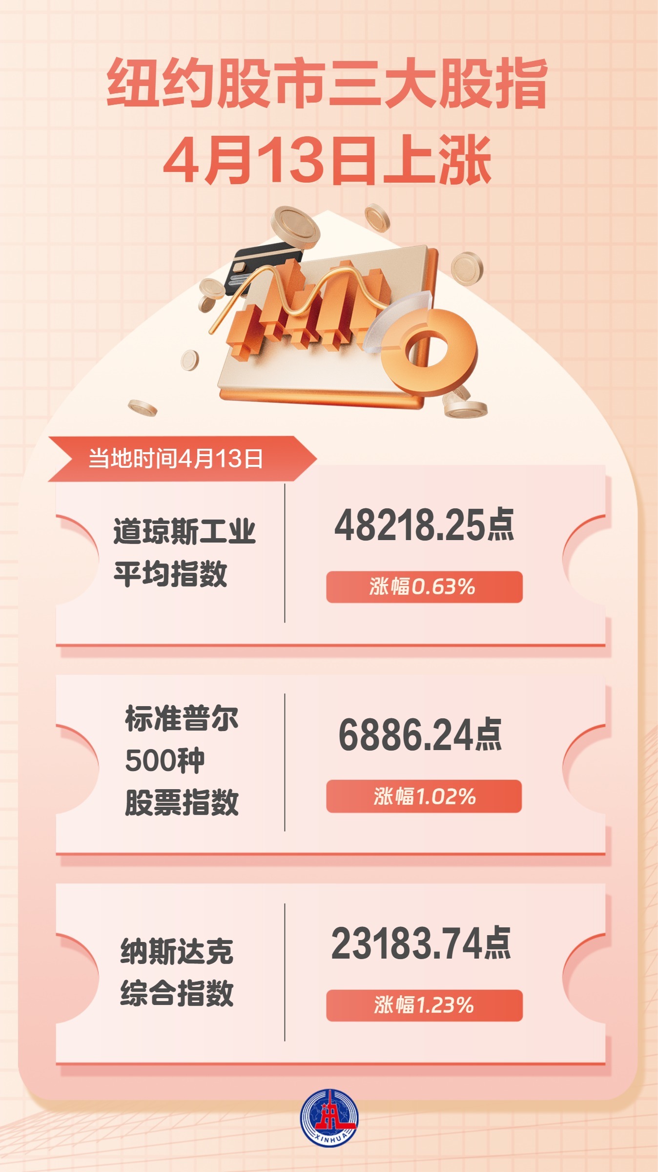 纽约股市三大股指当地时间4月13日显著上涨。